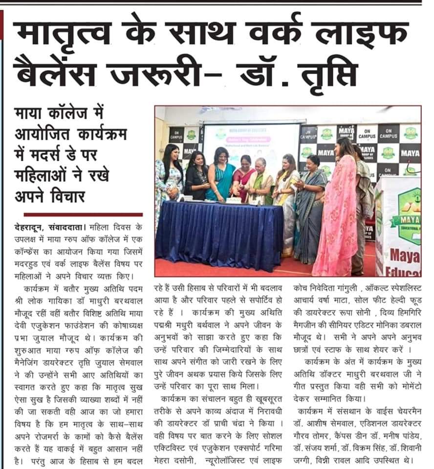 डीबीएस कॉलेज देहरादून में आर्यन संगठन के माध्यम से आज माया कॉलेज की प्रबंध निदेशक डॉ. तृप्ति जुयाल सेमवाल ने उनके ड्रीम प्रोजेक्ट हरित प्रदेश योजना का शुभारंभ किया। समारोह में डॉ तृप्ति द्वार डीबीएस सीकॉलेज प्रांगण में 14 नीम के पेड़ों का पौधारोपण किया गया। वृक्षरोप कार्यक्रम में मुख्य अतिथि के कक्ष में डॉ. तृप्ति ने डॉ तृप्ति ने शिक्षा स्वाथ्य और पर्यावरण की बात करते हुए आर्यन छात्र संगठन के पदाधिकारियो से अपील की कि आर्यन छात्र संगठन उत्तराखंड के सभी जिलों में उनके साथ मिलें और आगामी वर्ष में 100-100 पेड लगायें।साथ-साथ डॉ. तृप्ति ने उत्तराखंड के निर्धन विद्यार्थियों के लिए माया कॉलेज में छात्रवृति देने का वादा किया। साथ-साथ उनको कहा कि प्रदेश के सुदूरवर्ती क्षेत्रों में निःशुल्क स्वास्थ्य शिविर लगाने के लिए माया कॉलेज प्रतिबध्द है। डीबीएस कॉलेज के प्रचार्य डॉ. वीसी पांडे ने विद्यार्थियों से अपील की कि वह बढ़ चढ़कर इस वृक्षारोपण अभियान में हिस्सा लें। आर्यन संगठन की ओर से श्री विकेंद्र सिंह कैथैत ने कहा कि डॉ. तृप्ति के इस हरित प्रदेश अभियान में आर्यन संगठन कंधे से कंधा मिल के उनके साथ है और सभी छात्र उत्तराखंड के सभी जिलों में इस अभियान उनके साथ हैं।