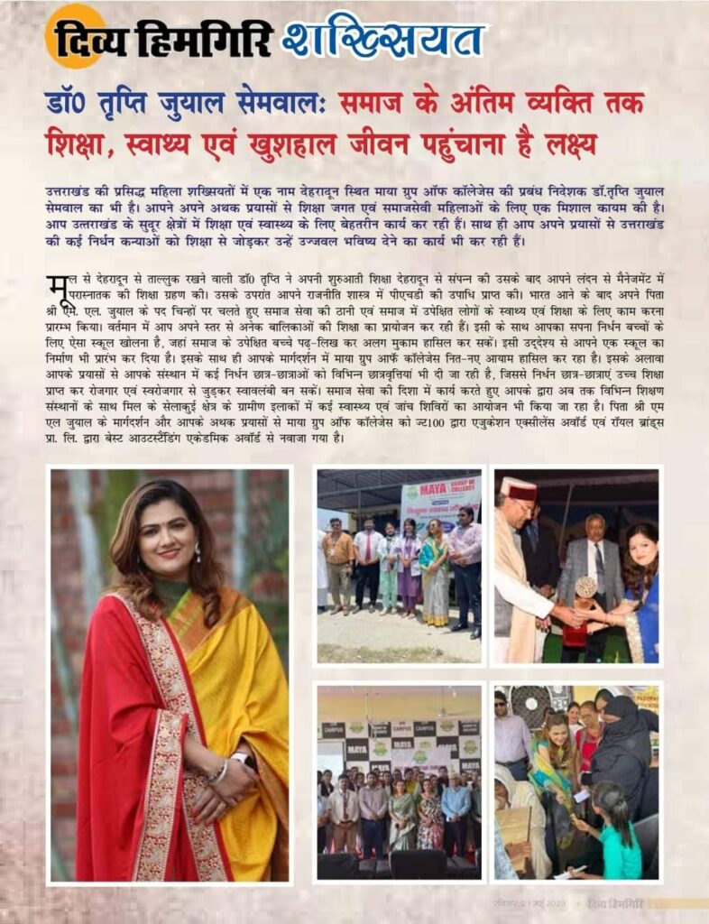 भारत आने के बाद अपने पिता श्री एम. एल. जुयाल के पदचिन्हों पर चलते हुए डॉ. तृप्ति ने समाज सेवा की ठानी एवं समाज में उपेक्षित लोगो के स्वाथ्य एवं शिक्षा के लिए काम करना प्रारम्भ किया इस समय डॉ. तृप्ति अनेक बालिकाओं की शिक्षा को प्रायोजन कर रही है। इसी के साथ उनका सपना है की वो निर्धन बच्चों के लिए एक ऐसा स्कूल खोलें जिसमें समाज में उपेक्षित बच्चे पढ़ के अपना एक मुकाम पा सके, जिसके लिए उन्होंने एक स्कूल का निर्माण भी प्रारम्भ कर दिया है। इसके साथ ही डॉ. तृप्ति के मार्गदर्शन में माया ग्रुप ऑफ कॉलेजेस में निर्धन छात्र छात्राओं के लिए विभिन्न छात्रवृत्तियां भी दी जा रही है जिससे निर्धन छात्र छात्राओं को भी उच्च शिक्षा प्राप्त हो सके और वो उपयुक्त रोजगार पा सकें या स्वयं का स्वरोजगार शुरू कर स्वावलंबी बन सकें। समाज सेवा की दिशा में कार्य करते हुए डॉ. तृप्ति द्वारा सेलाकुई क्षेत्र के विभिन्न ग्राम देहात में स्वाथ्य जांच शिविरों का आयोजन भी किया जा रहा है। इसके साथ ही डॉ. तृप्ति पर्यावरण संरक्षण में भी काफी सक्रिय रहती हैं। डॉ. तृप्ति वृक्षारोपण, स्वच्छता अभियान, सड़क किनारे से पॉलिथीन उन्मूलन और पक्षी घरों की स्थापना जैसी कई सामाजिक गतिविधियों का आयोजन करती हैं और उनमें भाग लेती हैं। हाल ही में डॉ. तृप्ति ने डीबीएस कॉलेज में वृक्षारोपण कर हर जिले में 100 पेड लगाने के लिए हरित उत्तराखंड अभियान की शुरुआत की है।